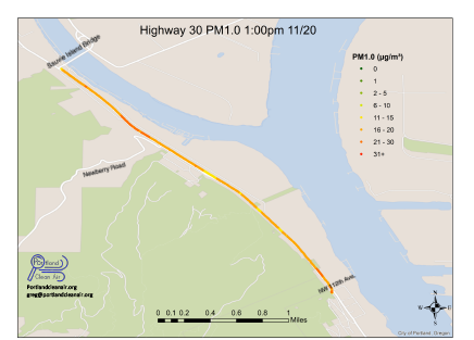 Publicly available maps have previously been based on modeling studies; they portray educated guesses–and don’t reflect collected particulate monitor data. Now, however, maps of diesel particulate concentrations in Portland neighborhoods using collected data are possible. By collecting data in one day within an ideal time window, an accurate depiction of particulate data can be measured and this allows for comparisons over time. Attaching a diesel particulate monitor (a 2019 LNA donation) to my bike with zip ties, I captured thousands of samples in my hour-long test ride along Hwy 30 between 112th St and the Sauvie Island Bridge. This information included the exact locations of the samples and the particulate concentrations. A GIS specialist, paid for by a second LNA donation, plotted this and the resulting map.