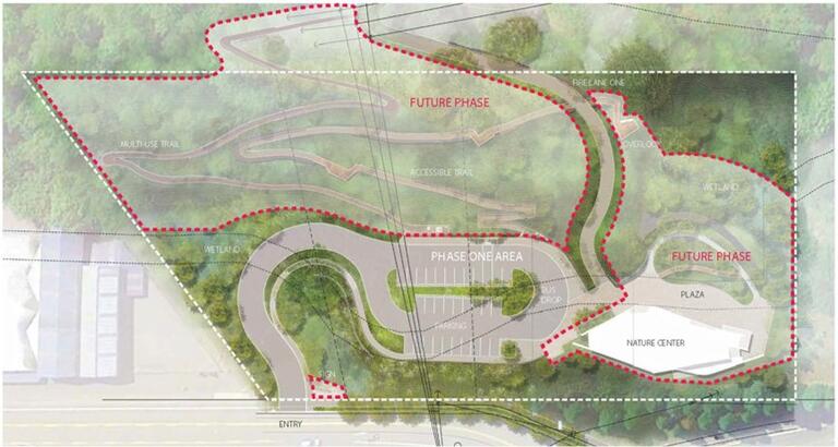 A future Nature Center will include educational exhibits, community gathering and learning spaces, classrooms, public restrooms, and office functions. An additional future phase will include more gradual ADA accessible trails partway into the park.