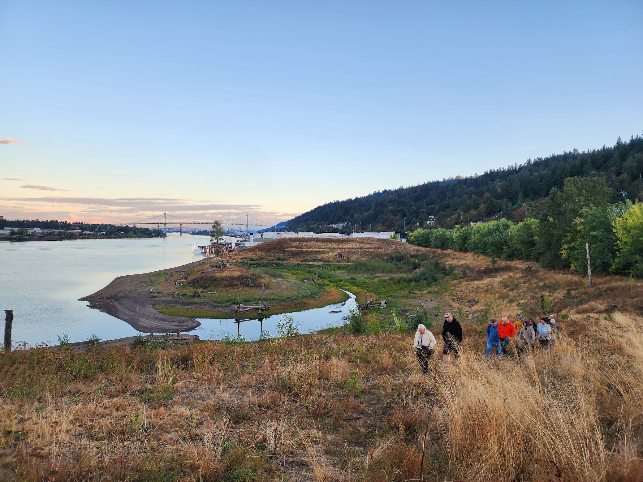 On September 9th, RestorCap wetlands ecologist Kari Dupler led a guided walk through the Linnton Mill restoration area, sharing information about the project history and progress. To restore the land, several hundred thousand cubic yards of soil were excavated and moved, restoring the area to the low-lying flood plain it would have been pre-colonization. During excavation, soil in two small sites was found to contain PCBs exceeding Portland Harbor limits – that dirt was buried deep under the new hill and covered in concrete to prevent any exposure in the future.