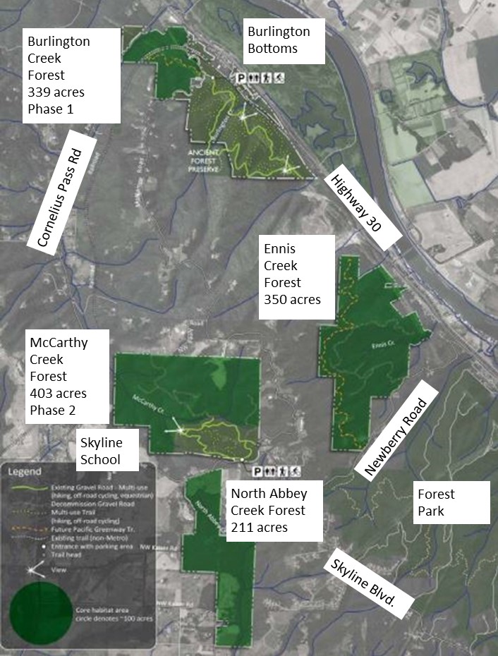 The long-term plan envisions multi-use trails, including bicycling, at three of the sites. Phase One, the Burlington Creek Forest site, would include parking and toilet facilities off Highway 30 allowing new pedestrian and small hamlet of Burlington along Highway 30 near the intersection with Cornelius Pass Road.