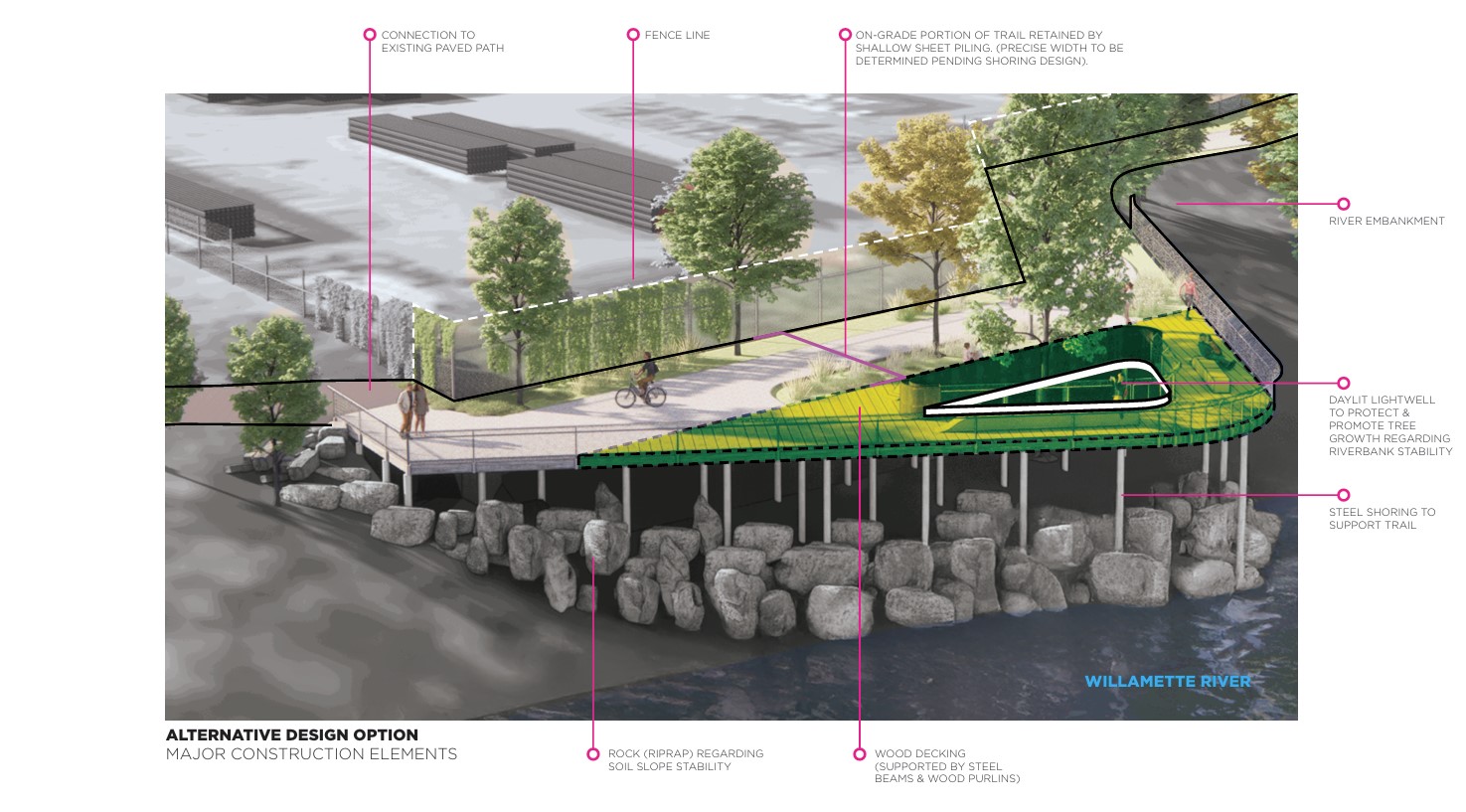 According to Noel Johnson, the project’s development manager, all tasks in this two year effort, including engineering, design and construction contracts are ready. The final hold-up is two-fold: George Webb’s firm – Babcock (aka Harmer Steel) is refusing to abide by a condition of approval he proposed and accepted in 1998 when redeveloping the site for its current business use. Concurrently, the City’s Parks Bureau is refusing to enforce its laws and is refusing to process the project’s permit.