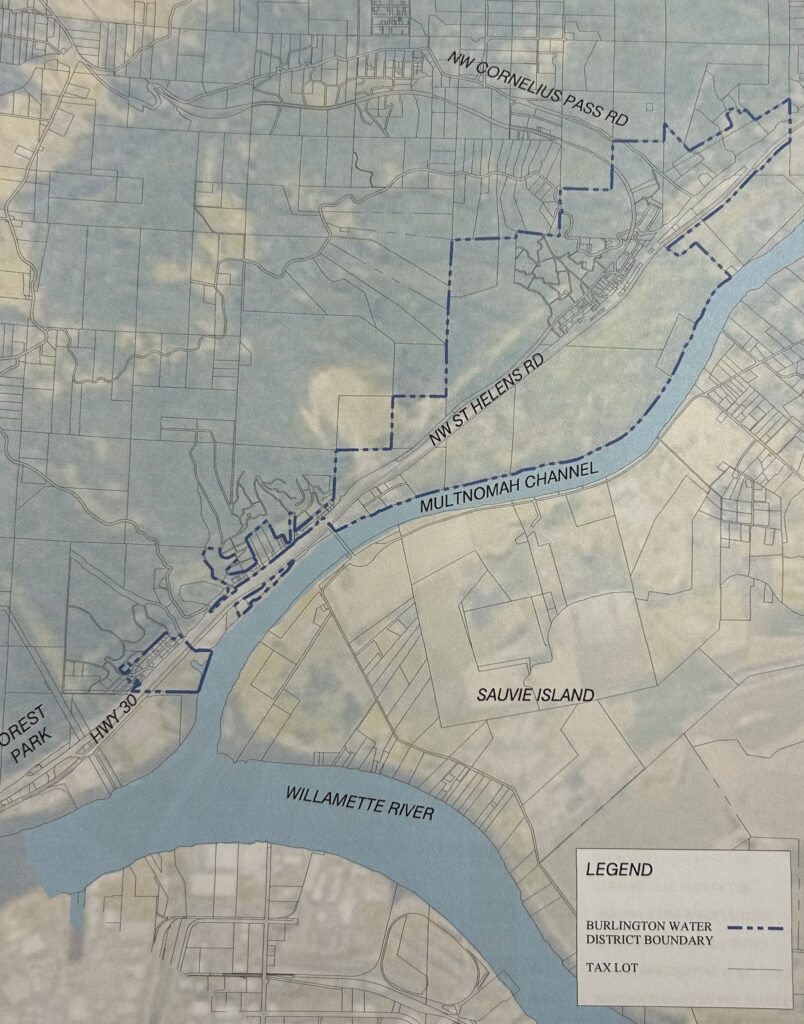 The Burlington Water District area generally lies north of NW Harborton Drive to approximately 1,500 feet north of Cornelius Pass Road, straddling both sides of NW St. Helens Road. The BWD serves about 400 people with 119 water service connections. The BWD contracts water service and fire service with the City of Portland.